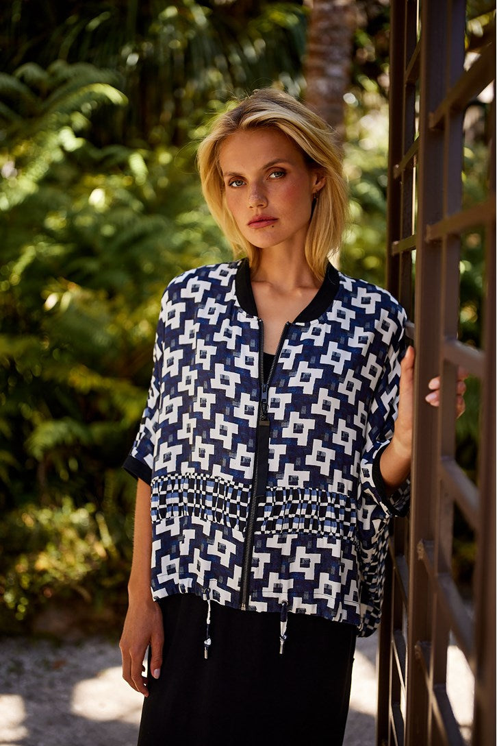 Drop shoulder Cortez print jacket is made of soft viscose fabric. It has ribbed neck and sleeves cuffs. Single ended zipper front opening and gathering at waist. Hem is finished with adjustable ties.