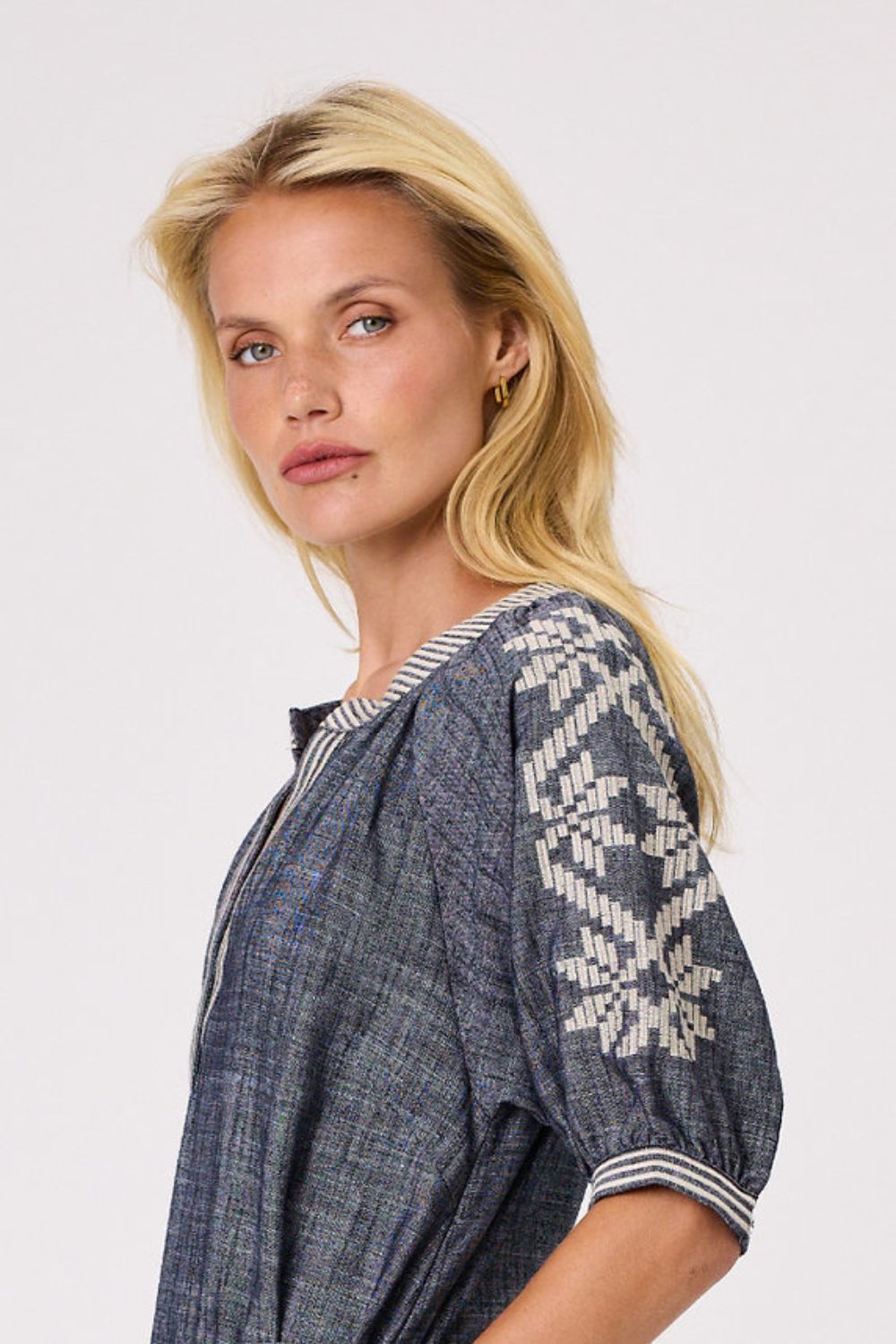 This Fortune Linen blend midi dress features intricate embroidery at neckline and sleeves. Two side pockets and hem finished with split at centre front. Separate self-fabric belt that can be wear with or without it.