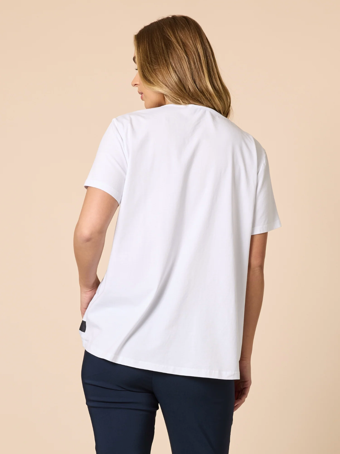 Add graphic sophistication to your everyday rotation with the Geometric Top—a thoughtfully designed piece that balances artistic expression with wearable refinement. The abstract block print in navy and neutral tones creates visual interest while maintaining versatility. Constructed with a breathable linen front and soft cotton jersey back, this top delivers textural contrast and all-day comfort. Short sleeves and a classic round neckline ensure effortless styling—pair with wide-leg trousers for polished ease or casual denim for relaxed appeal. True to size with a hip-length cut.