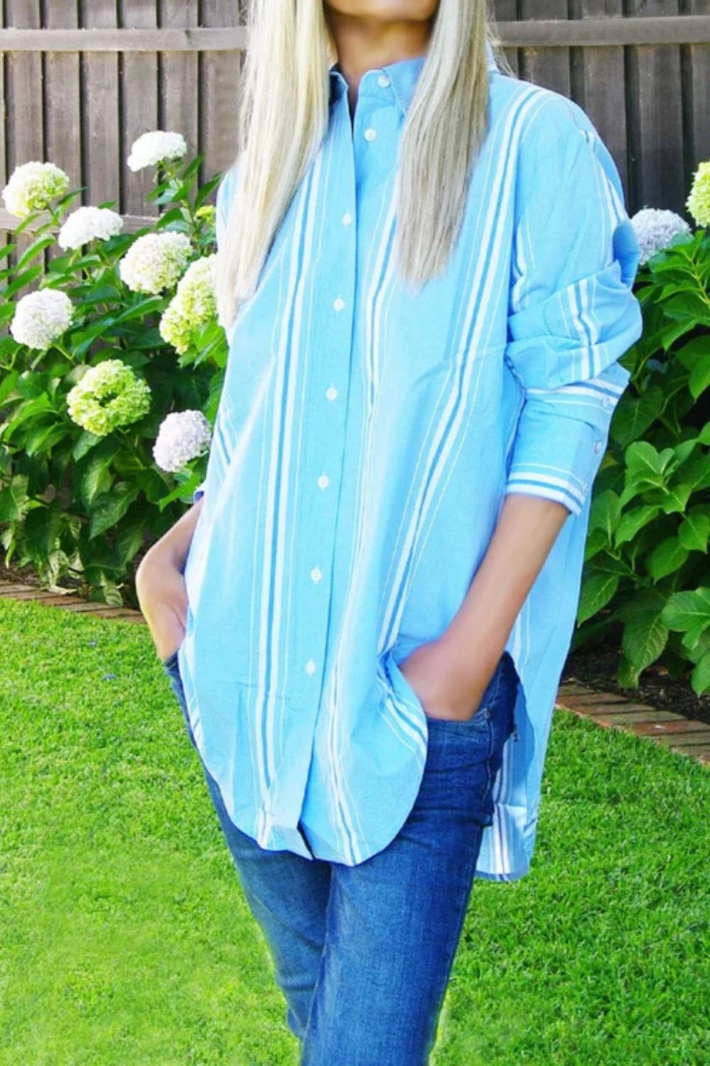 The Harriot Stripe Shirt in Chambray is crafted from 100% pure cotton, offering breathable comfort with an oversized, long-line silhouette. Its distinctive exaggerated curved hem, button-up front, and collar combine classic tailoring with modern style. Unique cuffs and delicate XOX embroidery on the back add thoughtful detailing, making this shirt a versatile wardrobe staple or a meaningful gift. Durable and soft, the Harriot Shirt blends effortless elegance with everyday practicality.