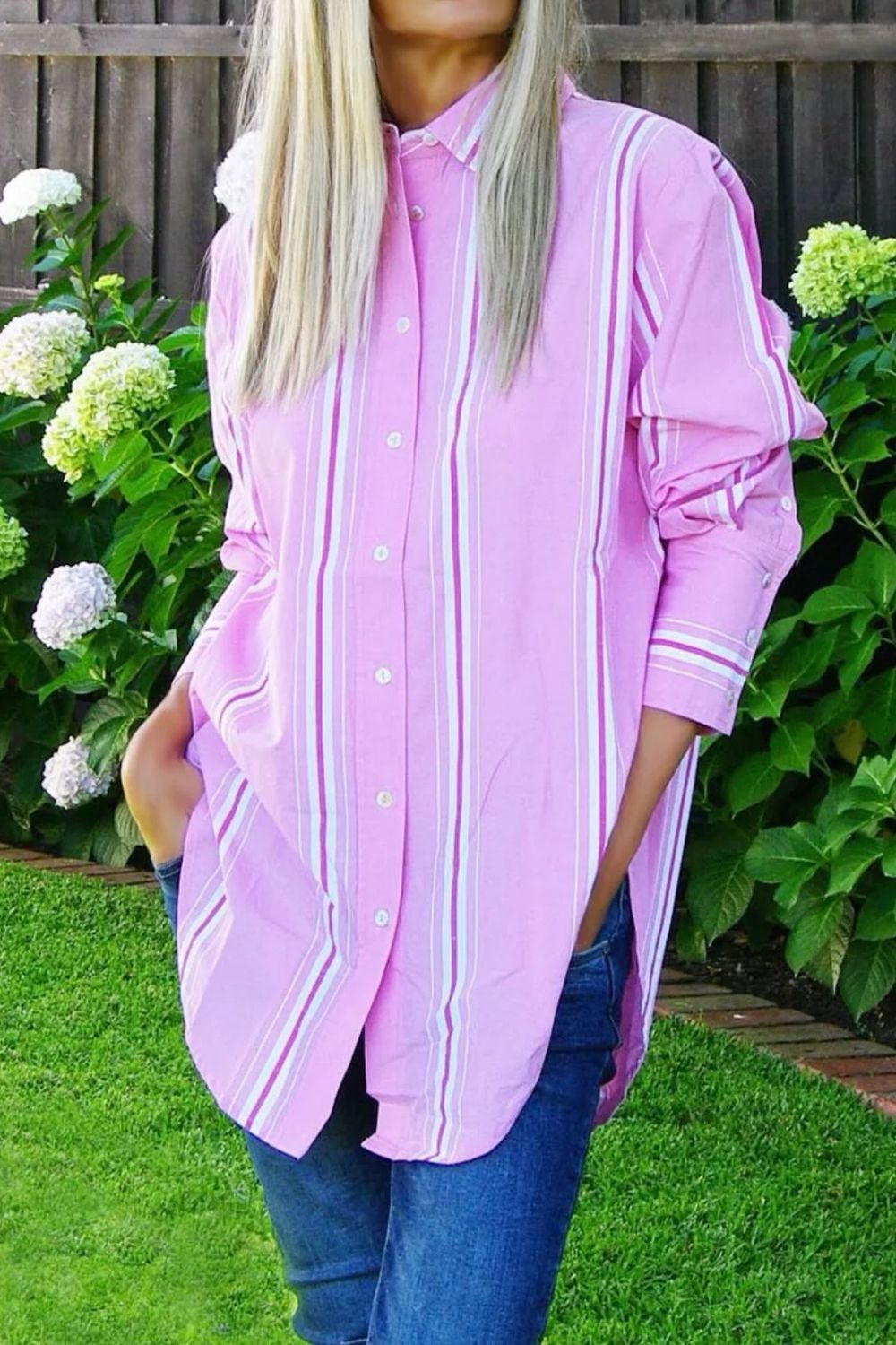 The Harriot Stripe Shirt in Pink Sherbet is crafted from 100% pure cotton, offering breathable comfort with an oversized, long-line silhouette. Its distinctive exaggerated curved hem, button-up front, and collar combine classic tailoring with modern style. Unique cuffs and delicate XOX embroidery on the back add thoughtful detailing, making this shirt a versatile wardrobe staple or a meaningful gift. Durable and soft, the Harriot Shirt blends effortless elegance with everyday practicality.