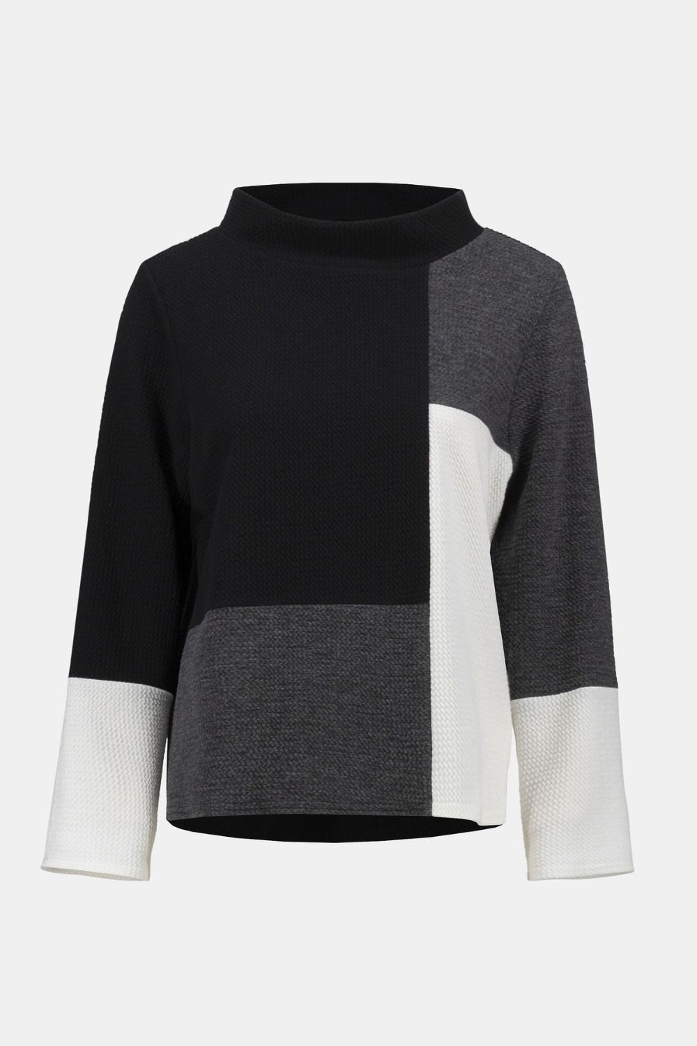 This textured jacquard knit top complements any contemporary attire. The elegant colour-block print adds a striking visual appeal. The boxy silhouette and funnel collar pair perfectly to create a structured yet relaxed design.