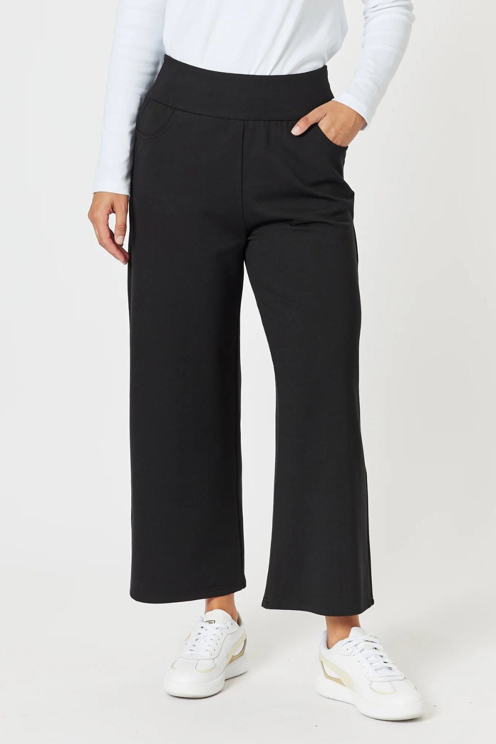 Effortlessly stylish and endlessly comfortable, the Kimmy Ponti Pant is the perfect blend of ease and sophistication. Designed with a wide leg and relaxed fit, this pull-on style offers a flattering silhouette with a cropped length for a modern touch.
