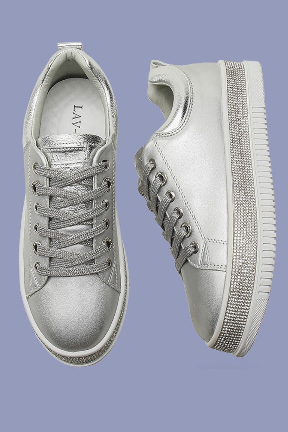 These beautiful silver sneakers have the special feature of having 8 rows of crystals on the soles and 2 unique diamonti lace rings.