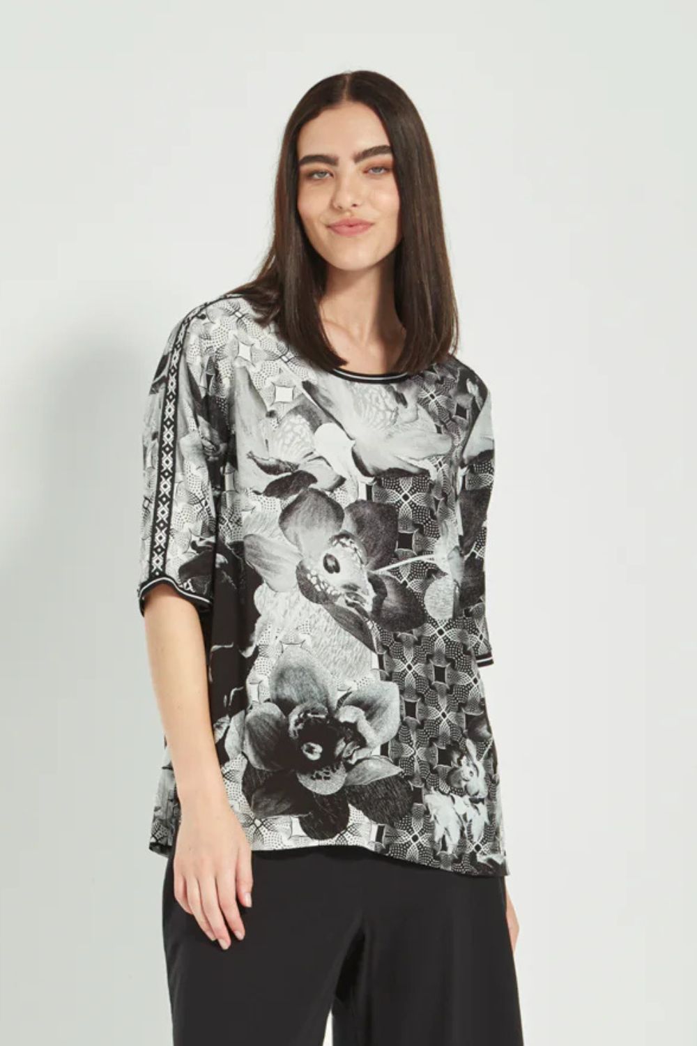 The Macy top features a printed shell design with a rib-knit trim at the neckline and cuffs, accented by a bold striped detail. A feature stripe runs from the shoulder down to the sleeve cuff, adding a sporty, modern touch. With a rounded neckline and elbow-length sleeves, this top is finished with side splits at the hem and falls to the hip for a flattering, easy-to-wear silhouette.