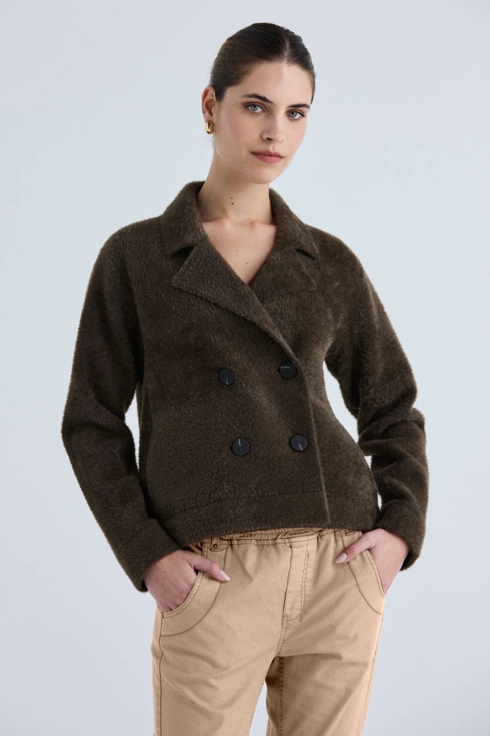 The Phoenix Jacket: The epitome of cozy sophistication. Crafted in a soft knit and featuring double-breasted styling with power-coated metal hardware, this piece is a must-have in any wardrobe. Its cropped length offers versatility, allowing you to layer it gracefully over dresses or your favourite pants, making a statement of comfort and style.