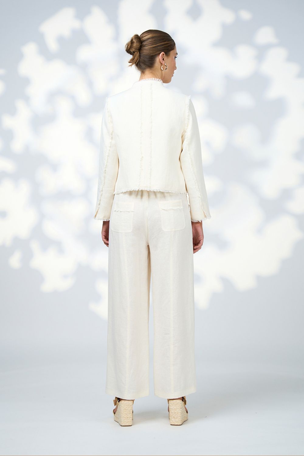 This military-inspired jacket features a delicate texture, frayed hems, elegant princess seams, and asymmetrical button detailing. It is fully lined for comfort and crafted from a blend of 55% ramie, 25% linen, and 20% cotton.
