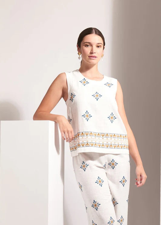 This elegant shell top showcases a round neckline and sleeveless design, highlighted by a distinctive border print along the hem. Crafted from a blend of 70% viscose and 30% linen for a refined finish.